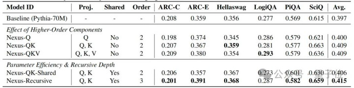 在Pythia-70M的消融实验中,使用权重共享的Nexus-QK-Shared版本,平均准确率仍比基线高出近1个百分点,而参数量毫无增加。